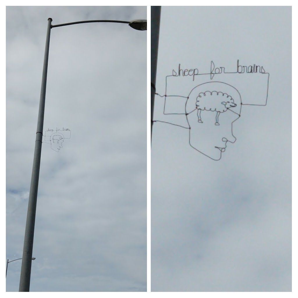 小雨が気になって空を見たら、足元を注意して歩いていて今まで気が付かなかった照明柱に付けられたワイアーアート見つけたわ。(私が見つけたワイアーアートふたつ目ね)