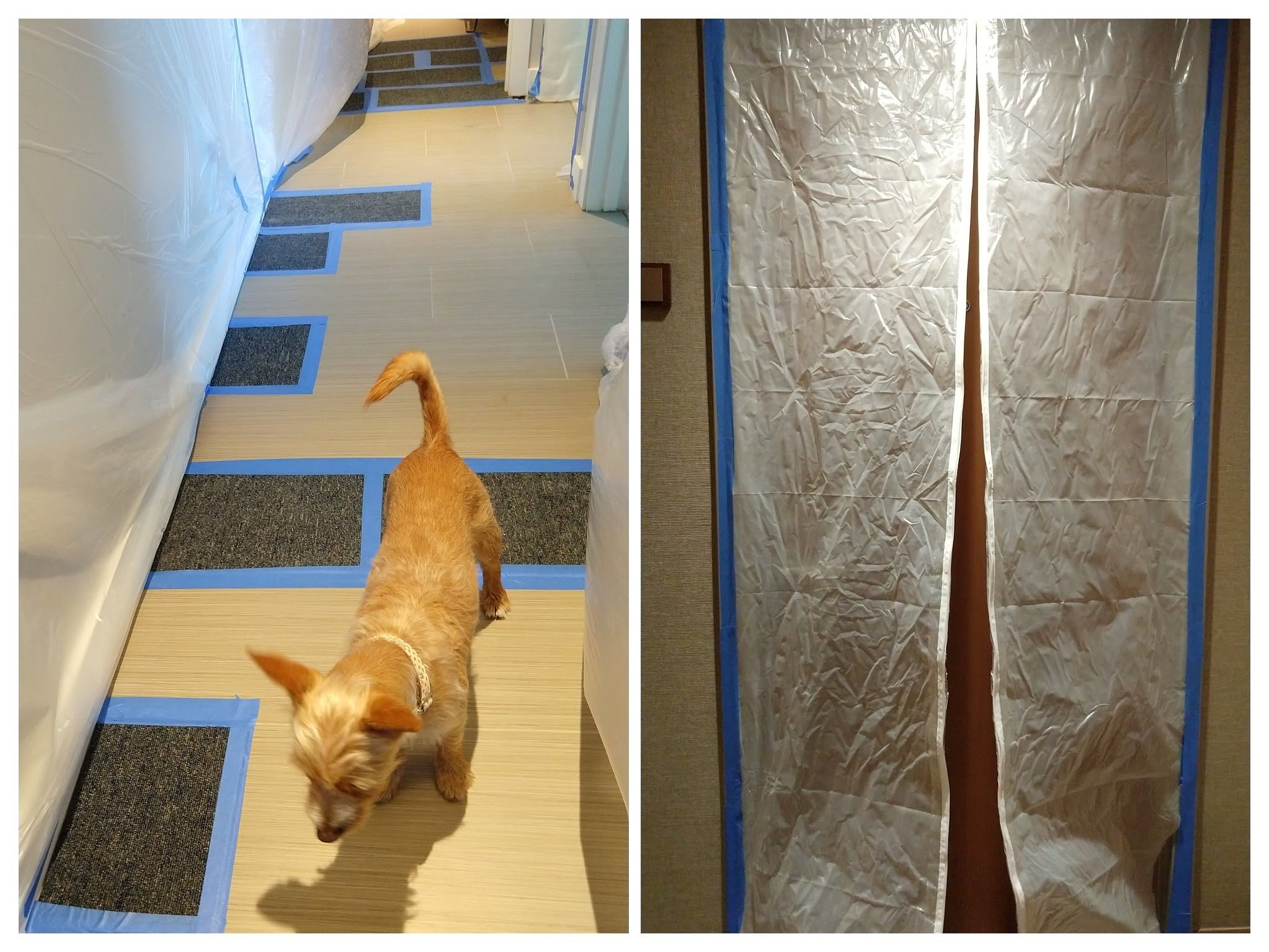 今回は防塵シートを壁中に張ってくれ、空気洗浄機を作動して作業をしてくれる丁寧な業者さんで良かったわ~。剥がしたタイル部分にはフェルトを臨時的に貼ってくれているので安全に歩き回れるのよね。