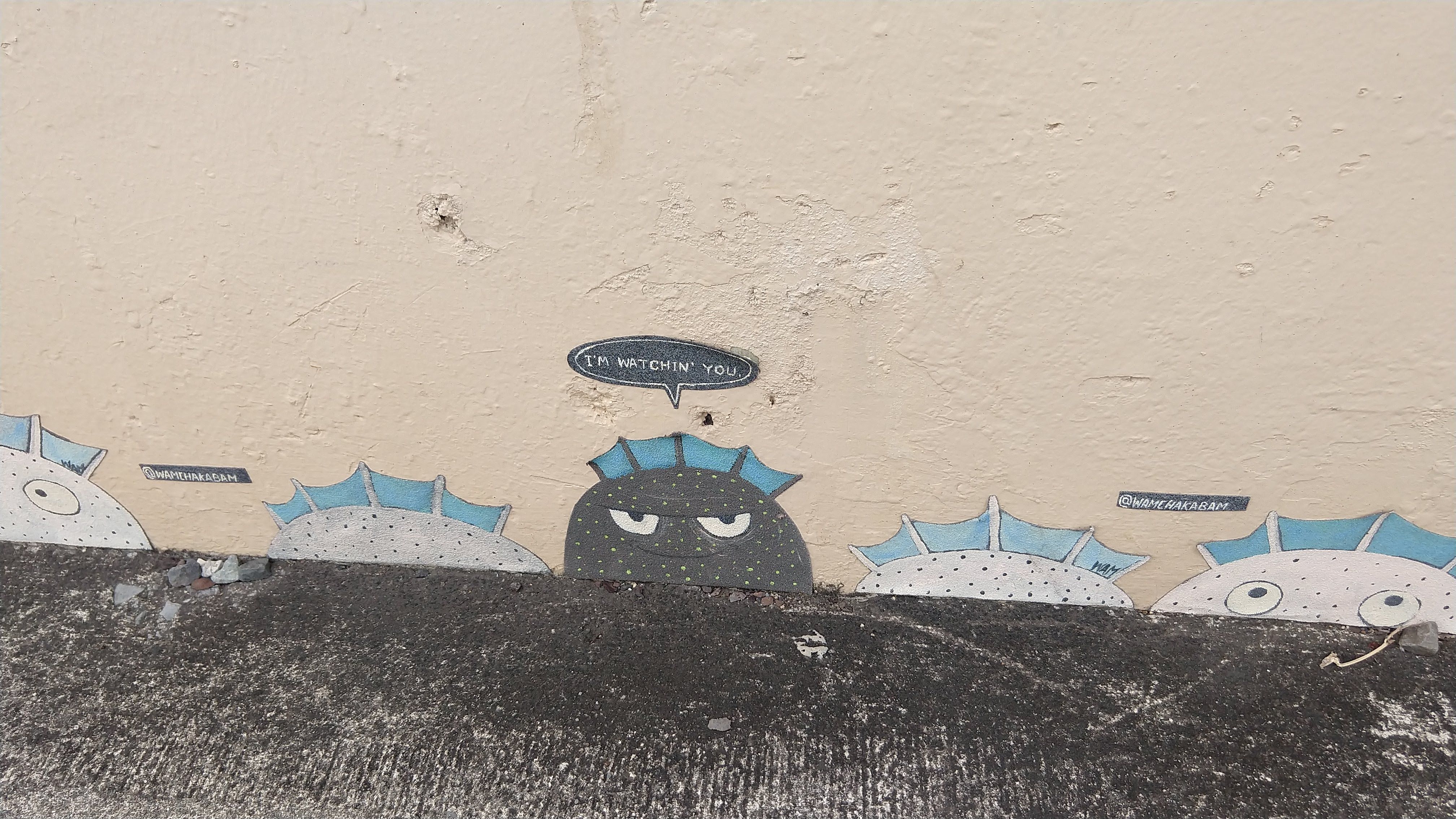 毎日通り過ぎるけど、いつもはドアが閉まっていて中がみえない所に、あかんべえモンスターの壁絵がある倉庫みたいな空間を発見。