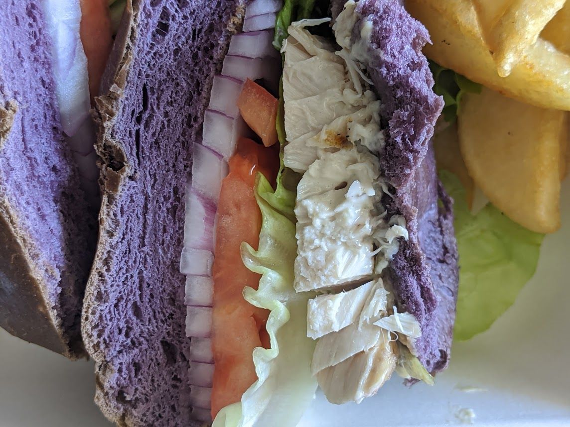 紫色のパンは「タロイモ」ハワイの主食。モチモチで美味しかったです。