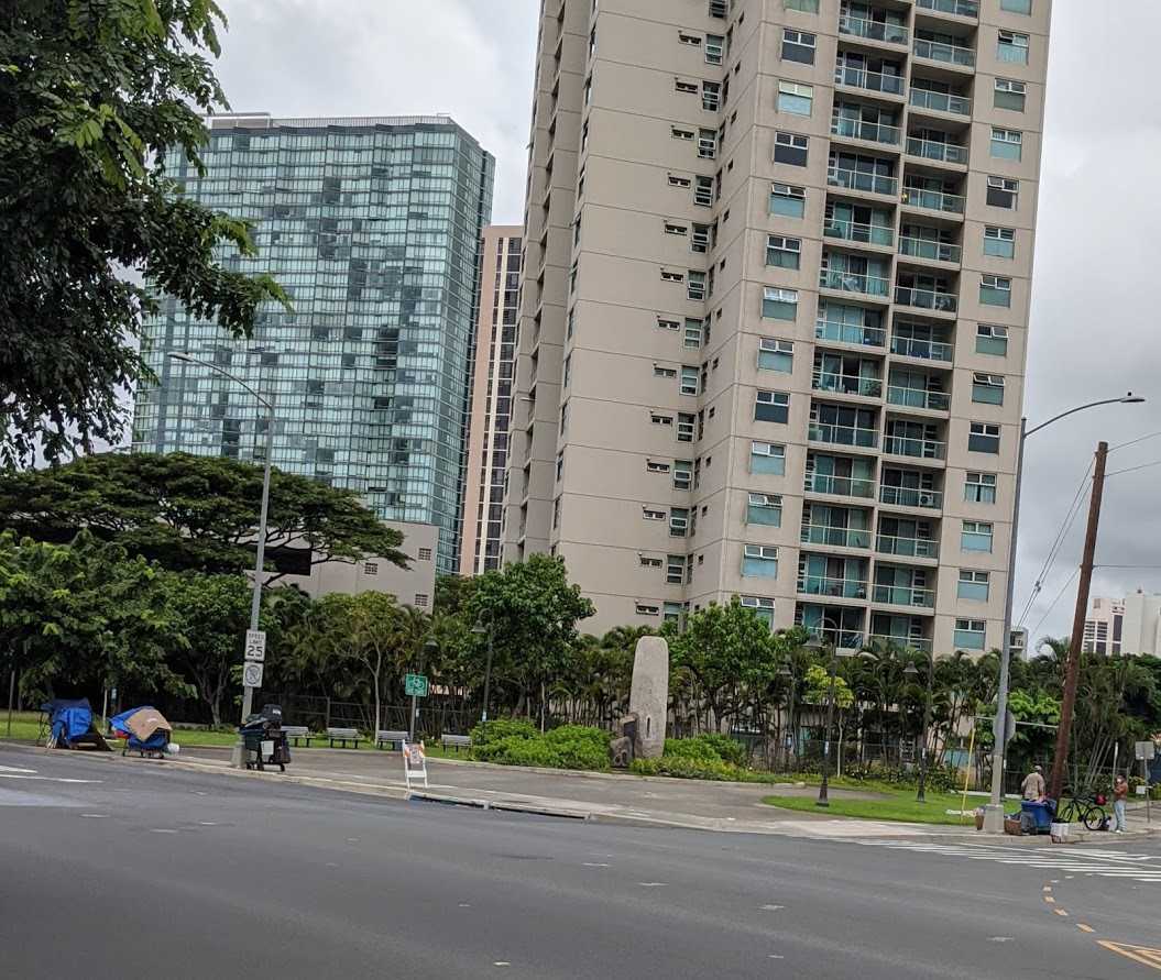 向こう側の歩道にはホームレスがポツリポツリと陣取りしている。