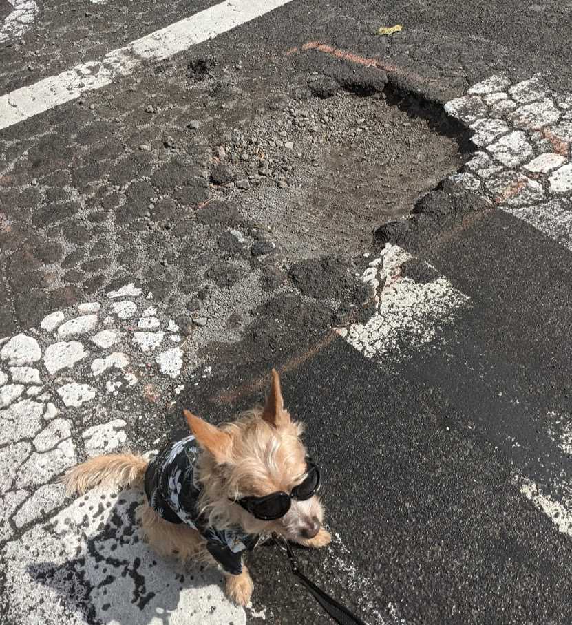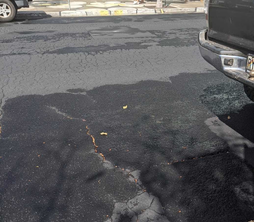 路上絵の部分にアスファルトを塗って補修した箇所は