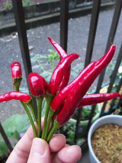 赤くなりました鷹の爪です。赤くなったのだけ収穫しましたが、青いのはまだまだ。これから一杯収穫できそうです。こちらは韓国とうがらし。まだ青いです。はたしてラー油ができるのか。。。