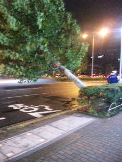 舞台を見に行ったワタクシです電車も止まり、街路樹もこんなん会社は「大荒れになる前に帰りなさい」と3時半には全員解散になったのよ。迷ったけど、問い合わせると「主催者が中止しないとおっしゃっていますので」と劇場。こりゃ行かなくちゃってことで、嵐の中を決行外に出た途端、傘の骨が一気に3本折れた。すぐに引き返して別の傘をもち、電車に乗ったら途中で「全線見合わせ」で動かず、乗り換え乗り換えでたどりついたら開始30分を過ぎてしまってピロチャンの宝塚もどきのタキシード&羽根が見られなかった。くそ~っでも尾崎亜美さんの生歌が聞けた~今日の舞台がDVDになるってことで、予約しそうになったけどそんな余裕はないのであきらめたうむ、今日もピロチャンは美しかった再開した地下鉄でギューギュー詰めになりながら家に帰ったら2階のプランターが落下して、うちのベランダに真っ二つになって落ちていた。明日、2階の住人にキツーく言っておこう。