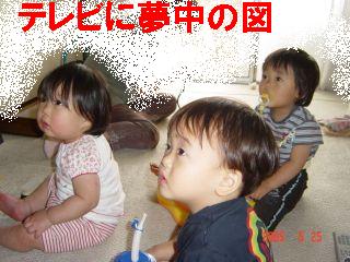 5月28日(土)天気今日は予定も無かったので調子に乗って12時まで寝ちゃってました。寝たのが4時だったので、それでも8時間睡眠です。翼も昨夜寝たのが遅かったので、当然のように12時半まで寝てたよ。家の前の小学校では運動会が開催されてて、物凄く賑やかだったのに全く起きない親子ヾ(;´▽`A``アセアセ今って運動会で使うダンスの曲とかがカッコいいですよね~!!「これって絶対先生の趣味だべ??」って思うような曲ばっかり。リレー中とかのBGMも「なんちゃら行進曲」とかじゃなくて今流行ってる曲とかを使ってるんだよ~!!入退場とかも「マツケンサンバ」とかだったり(笑)翼が「おっ!」って反応してたよ(≧m≦)ぷっ!私が小学生の時なんて、ホント「創作ダンスの曲」って感じだったしリレーでは「なんちゃら行進曲」、コッテコテだったなぁ~(-ω-;)ウーン歌謡曲なんて使っても「ゴダイゴ」だった(笑)う~~ん☆時代を感じますなぁ。プププッ(* ̄m ̄)ノ彡☆ばんばん!!こんな20数年前の話をするのは止めようヾ(;´▽`A``アセアセ起きたと同時ぐらいに妹からメールが入って、今日友達と遊ぶ約束が流れちゃったので「遊びに行っていい?」って話でした。ヒマだったので今日も遊ぶ事に♪♪ちゃっちゃっと家事をして、翼にちょっとパンを食べさせて支度して1時半過ぎに我が家の下の公園で待ち合わせしました。翼は大チャン&綾たんの姿に気付くとキャーq(≧∇≦*)(*≧∇≦)pキャーって大騒ぎ!チビ達はチビ達で遊び出したので、私と妹はベンチに座ってお喋り。今日は涼しくて気持ち良かったな~(人´∀`).☆.。.:*・みんなまともにお昼を食べてなかったので、近所のファミレスに行ってランチ。大ちゃんと翼はアイス食べてご満悦♪で、また公園に戻って遊ばせました。←木に抱きついてますオマエはセミか???砂遊び中→山を作って枝を立ててお墓を作ってました(´Д`|||) ドヨーン大ちゃんが滑り台で遊びたいと言い出したので、みんなで滑り台へ。綾たんは上手に滑れるのに・・・翼ときたら・・・(´Д`|||) ドヨーン酷すぎやしないかい??ヾ(;´▽`A``アセアセまた轢かれたカエルみたいになってるし・・・(ノДT)アゥゥ何度滑ってもこの状態でした・・・( ̄  ̄;) うーんで、また砂場に戻って・・・大ちゃんと翼は二人仲良く砂で遊んでたよ。綾たんは寝ちゃった。1時間~1時間半ぐらい遊んで、帰る事に・・・・。家に帰ってきても大ちゃんと翼は仲良く遊んでてくれたので、私は非常に助かりましたv(。・ω・。)ィェィ♪翼のはしゃぎ様ったらなかったよ~~!!(≧m≦)ぷっ!キャー ヾ(≧∇≦*)〃ヾ(*≧∇≦)〃 キャーって奇声あげてたもんヾ(;´▽`A``アセアセ今夜はうちで夕食を食べてってもらおうと思って、カレーを大量に作りました。その間チビ達には昔マミイかなんかの付録で付いてたビデオを見せてたんだけど、手遊び歌が何曲か入ってて、それを見てた翼がいきなり踊りだしたの!!身体を左右に揺らしながらグーチョキ(微妙)パーってしながら(笑)それが凄く可愛くて→親ばか初めて合わせて踊ってたのでΣ(・ω・ノ)ノ! びっくりっ!でした。カメラで撮り忘れてて後悔(ノДT)アゥゥ最近ノリが良くて嬉しいな。大量のカレーと大量のマカロニサラダ・・・売れた売れた(笑)みんなガッツリ食べてくれたよ~!翼はまた遊び食べしててヾ(*`Д´*)ノ"彡☆ ケシカラン!!冷めて不味くなった頃に食べだしてたよ(´Д`|||) ドヨーン綾たんは今日もモリモリと素晴らしい食いっぷりだったよ。(゜∇゜ノノ"☆(゜∇゜ノノ"☆(゜∇゜ノノ"☆パチパチパチ!!!食いながら踊ってるデッコ王子(笑)これはモー娘。のビデオを見てたんだけど(笑)見ながら踊ってたよ。将来はモーオタ(モー娘。のオタク)だわ。プププッ(* ̄m ̄)ノ彡☆ばんばん!!踊ってないで食えって感じですが・・・(#゜Д゜) プンスコ!10時過ぎに妹の旦那が仕事帰りに迎えに寄ったので、バイバイする事に。カレーとマカロニサラダを手土産に(笑)あげました。下まで降りてお見送りをしたんだけど、「タイチャーー(ノд・。) グスン」って悲しげな声を出してるので、妹が「おいで」って手を出したら翼も手を差し出して車に乗っちゃったの(笑)「おっ!大ちゃん家に泊まってくれば??」って言いながら私と旦那が「"(@´▽`@)ノ""" バイバーイ 」て言ったら「イヤo((>ω<o))((o>ω<))oイヤ」って(≧m≦)ぷっ!結局戻ってきちゃったんだけど(-L-)クククまだお泊りはムリなようですヾ(;´▽`A``アセアセ大チャンなんて2歳になったばっかりの頃、一人で我が家に泊まったりしてたのに。翼はまだまだだな( ̄∀ ̄*)イヒッバイバイしてからお風呂に入って、今日は12時ぐらいに寝ました。明日も昼まで寝てるのかな??今日も大ちゃんと綾たんと沢山遊べて楽しかったようです♪私も妹とお喋り満喫出来て楽しかったわ~o(*^▽^*)o~♪また遊ぼうね~~ワーイヽ(゜∀゜)メ(゜∀゜)メ(゜∀゜)ノワーイ今日のお気に入り滑り台を滑ってくる大ちゃんを見て大ウケしてました。