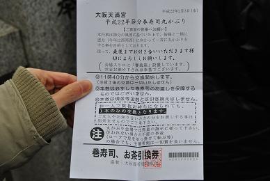 2/3に大阪天満宮で巻き寿司を貰ってきました節分イベントで1000人でお寿司の丸かぶりをしよう!というものです去年にそのイベントを初めて知ったんですが今年はご主人がお休みだったため一緒に行ってみました10:30~整理券を配るとのことだったのでちょっと早めに10時前に着くように家を出ましたやっぱり神社の境内にはすでに長蛇の列でしたがちゃんと整理券をもらえました11:40くらいから整理券で巻き寿司とお茶を交換できますここまではどこにでもある?巻き寿司イベントなんですがなんせここは大阪天満宮ですなぜここでイベントをするかっていうと・・・??なんとお払いをしてくれるのです結界を張ってなかなか本格的でしたよお払いが終わったら今年の恵方に向かって黙々と食べます今年の恵方はどっちかな?と迷っても大丈夫親切に教えてくれますかんぴょうとか甘いのが許せないので普段巻き寿司を食べないのですがこのイベントの時は一本丸々無心で食べきります私にとってこのイベントは巻き寿司を摂取する唯一の機会なのです巻き寿司食べようイベントでは海苔のチャリティー販売も行われて早々に売り切れるくらいの大特価だったみたいですなんでも焼き海苔が10枚100円?だったそうな・・・☆巻き寿司はみんなで食べようという趣旨でしているので持って帰ることはできませんのでご注意を。