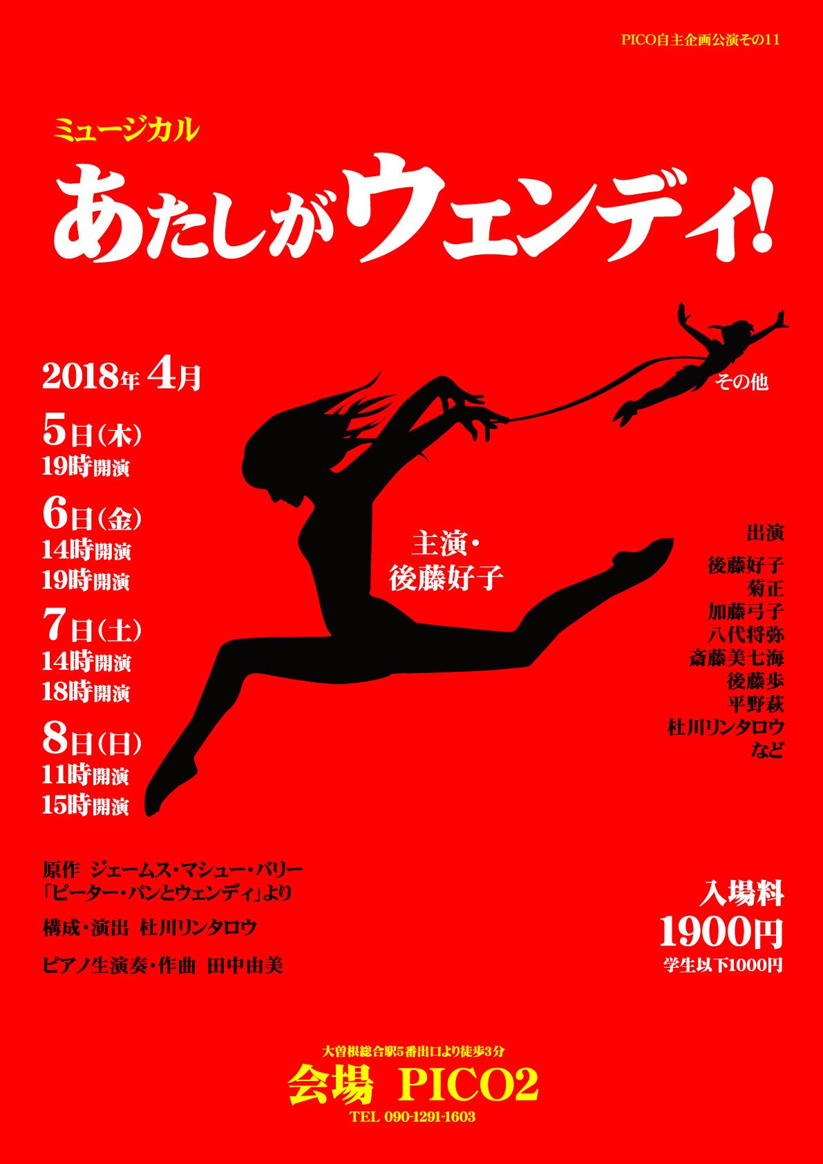さて恒例のアレの季節が近づいてきましたのでご案内いたします。PICO自主企画公演その11「ミュージカル あたしがウェンディ!」毎年4月は、後藤好子という自称永遠の28歳の女優を主役に据えて名作童話やミュージカルを蹂躙する公演があります。今年で5年目、赤いちゃんちゃんこも見えてきていい加減加齢が激しいので、そろそろ引導を渡そうかなというのが今回の趣旨です。女優なり歌手なり、舞台に立つものは心が折れたら、まあ、おしまいです。舞台上で素に戻るなど言語道断横断歩道は当然として、なにかしら怯んだり甘えたらおカネを取る資格はありません。日々の稽古は当然として上手い下手はキリがありませんし、技術などは値段相応であれば大丈夫でしょう。肝心なのは、純粋な観客がどこに納得するのかという一点。役者の覚悟なのです。今年は僕の中で、人生の終焉を迎え枯れつつある後藤好子自称28歳の覚悟と気合いを再確認する公演となっております(おおげさ)。4月5日19時6日14時/19時7日14時/18時8日11時/15時入場料1900円(学生以下1000円) 出演 後藤好子 菊正 加藤弓子 八代将弥 斎藤美七海 後藤歩 平野萩 杜川リンタロウ★★イギリスはロンドンに住む美しい女の子・ウェンディ。 彼女は今年も自称28歳、 いつまでも少女の心を持ち続ける女性でありました。そんな彼女の元に、ある日一人の男の子がやってきます。彼の名前は、ピーターパン。そう、誰もが知っている永遠の少年であります。ピーターパンを目ざとく見つけたウェンディはしかみついて叫びました、「あたしをネバーランドへGOGO連れて行ってよ!」と… ずっとピーターパンシンドローム的な何かを前世の業みたいに繰り返しているPICO四月公演。いよいよそれをテーマに掘り下げてしまう気がします。これは大丈夫か、色々な意味で大丈夫なのか。我に帰ったら花山に負けたスペックみたいに急激にしなしなになってしまわないか、いやもうなって(ryそんなこんなで今年も始まってしまいますが、 小さいころに宝島かどっかに行きたかったと呟いて照れた分だけ大人になった人ならば誰でも楽しんで鑑賞できる娯楽お笑いミュージカルですので、どうぞふるってご来場くださいませませ。★★というわけで、何も考えずにゲラゲラ笑える公演です。後藤さんの謎提案のおかげで無駄に公演数が多いので、まだまだ客席は空いております。ぜひどうぞ!