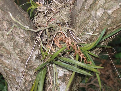 風蘭が冷たい風に毎年きれいな花をさかせます まだまだはやいです庭に出てみるといろいろな生物がもう春の用意をしています