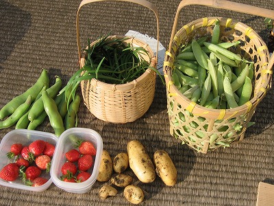 今日の収穫です 新ジャガ 空豆 グリーンピース 苺 ニラ 全部今日の夕食になりました
