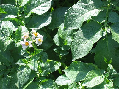 やっと花が咲きました 探り採りで食べました 卵大くらいでしたが新ジャガはおいしかったです これからどんどん大きくなるでしょう夕方より雨が降り始めました 野菜にはいい雨です まさに慈雨ですね