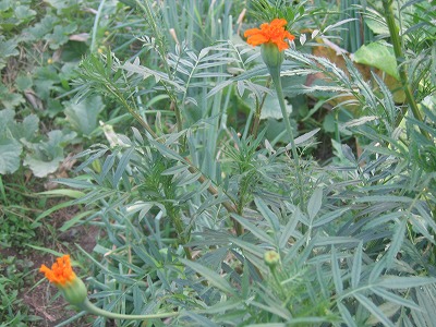 センチュウ対策用に植えたアフリカンマリーゴールド、がやっと蕾ですかなり大きくなるとか 効果はあるのでしょうか大雪山が元気です たくさんの花をつけますコスモスと仲良く並んで咲いてます