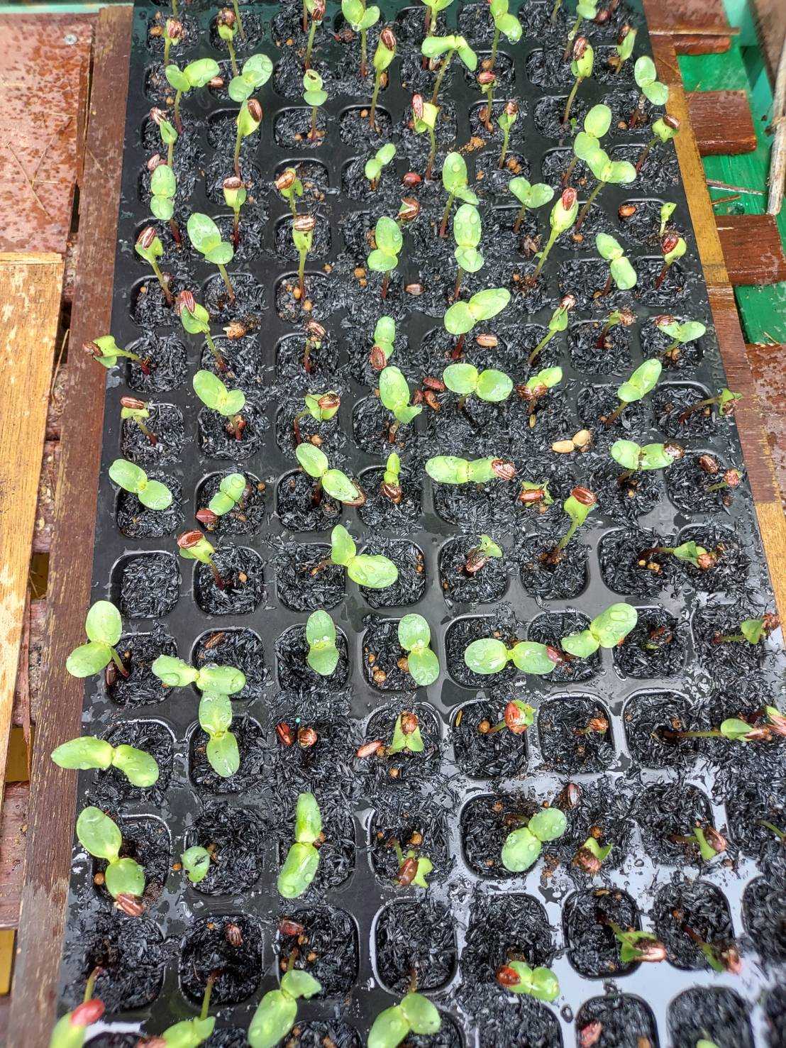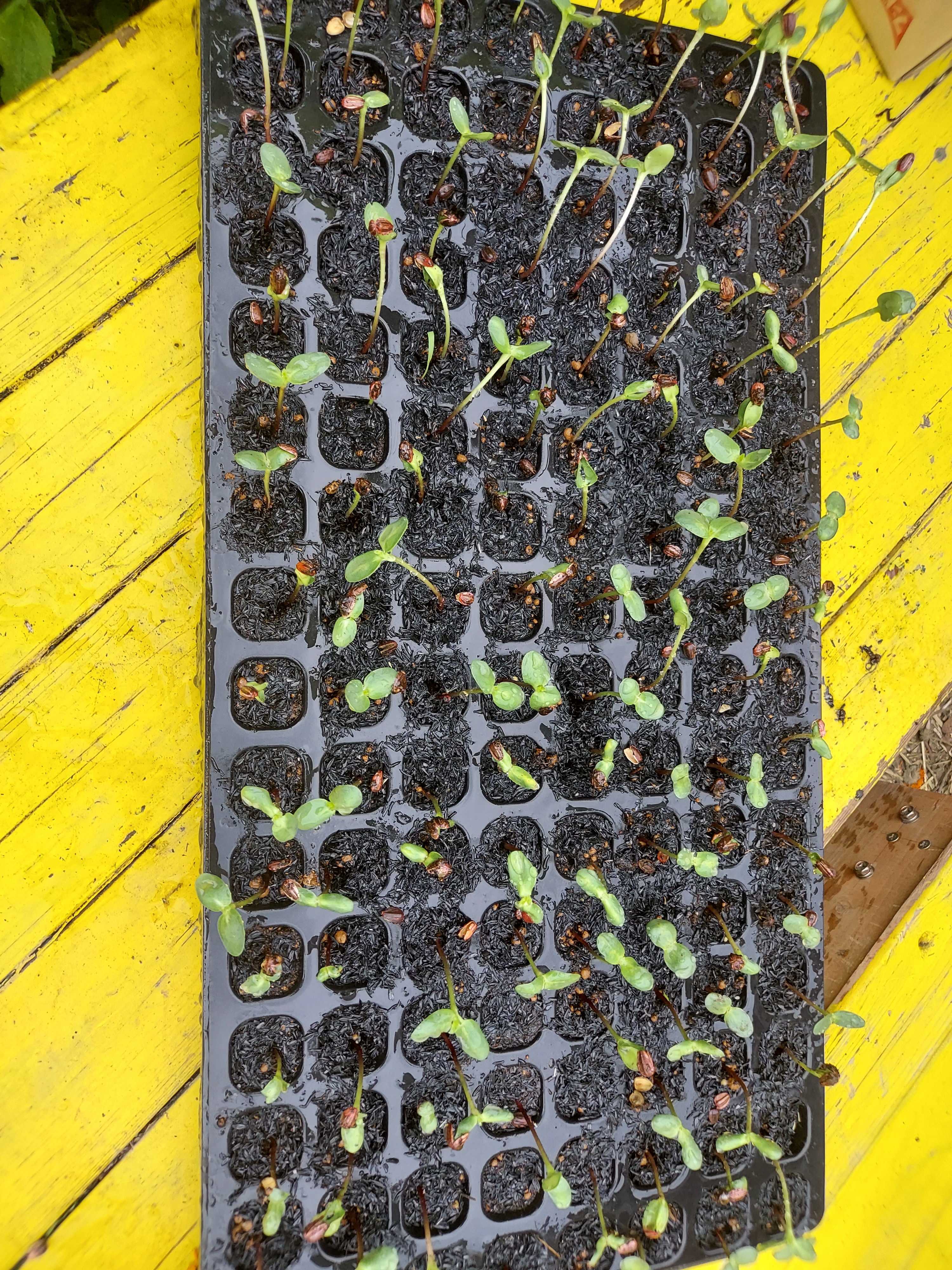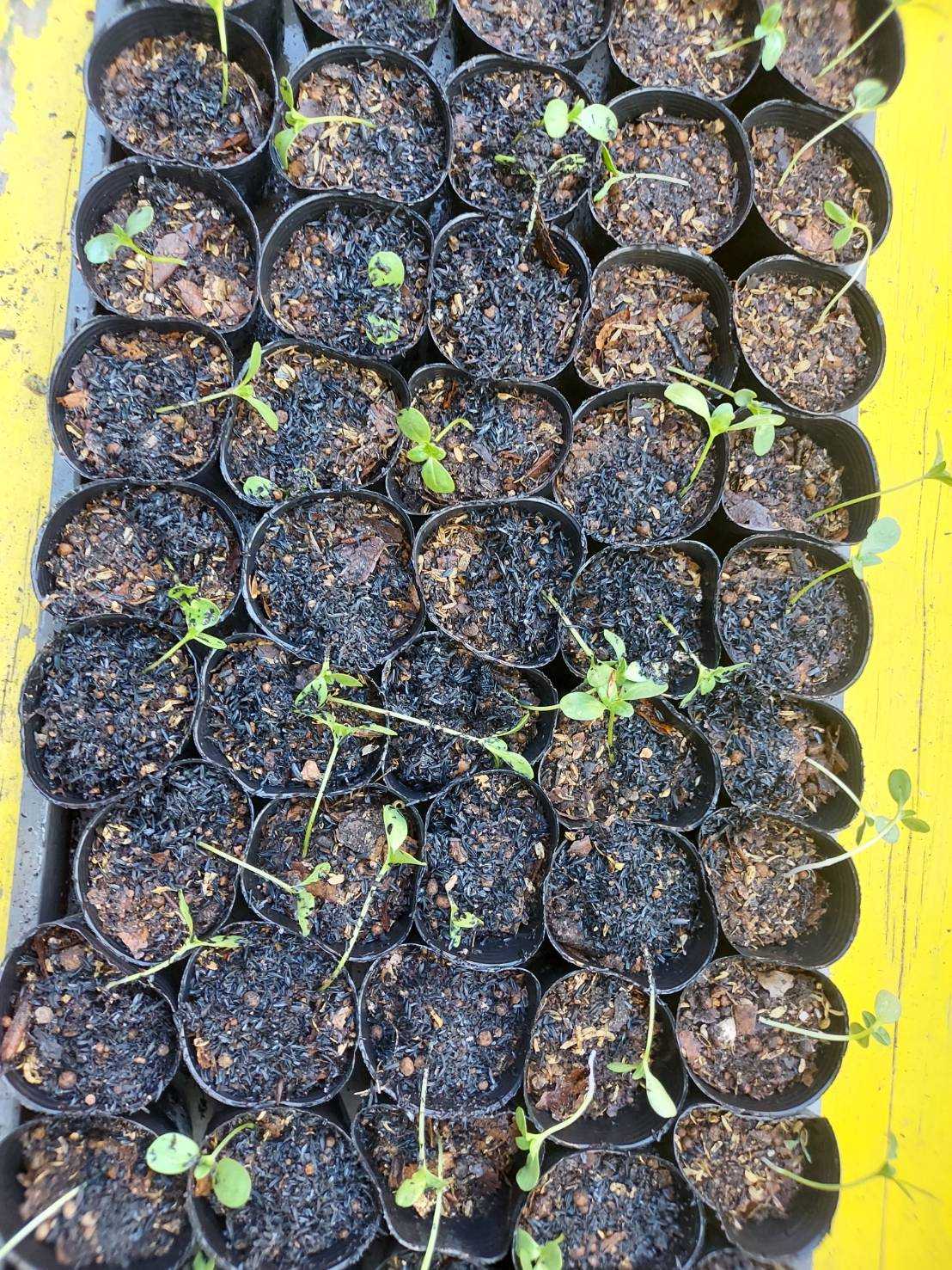 鶏頭のシャロンをセルトレーからポットへ移す。シャロンは初めて育てる鶏頭だ。セルトレーでスクスクと育った。100穴。発芽率はまあまあ。まだ小さい芽もある。同じ条件で種蒔きしたのに育ち具合がこんなにも違う。