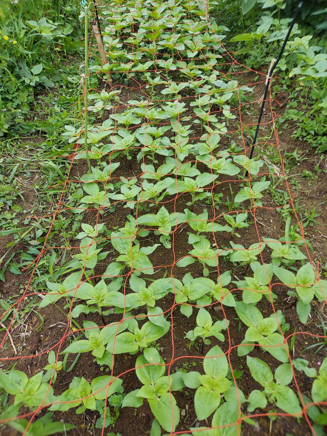 ひまわりのオレンジ128穴のうち120穴の発芽。発芽率が高い。今日植える。第三畑。4月24日に植えたオレンジ。ようやくフラワーネットの高さまでになった。宿根ヒマワリが元気に育っている。つぼみが出ている。