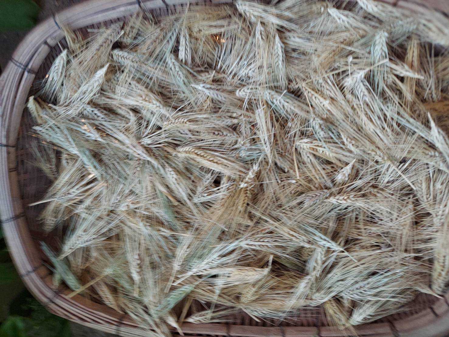 麦穂収穫。麦穂は食用ではなく組花のアレンジに使う。青い麦穂は切り花になかなかのもの。これは来年用の種として秋まで保存。赤い空豆収穫。ご飯と混ぜると赤飯のようになる。これは来年の種用として保存。