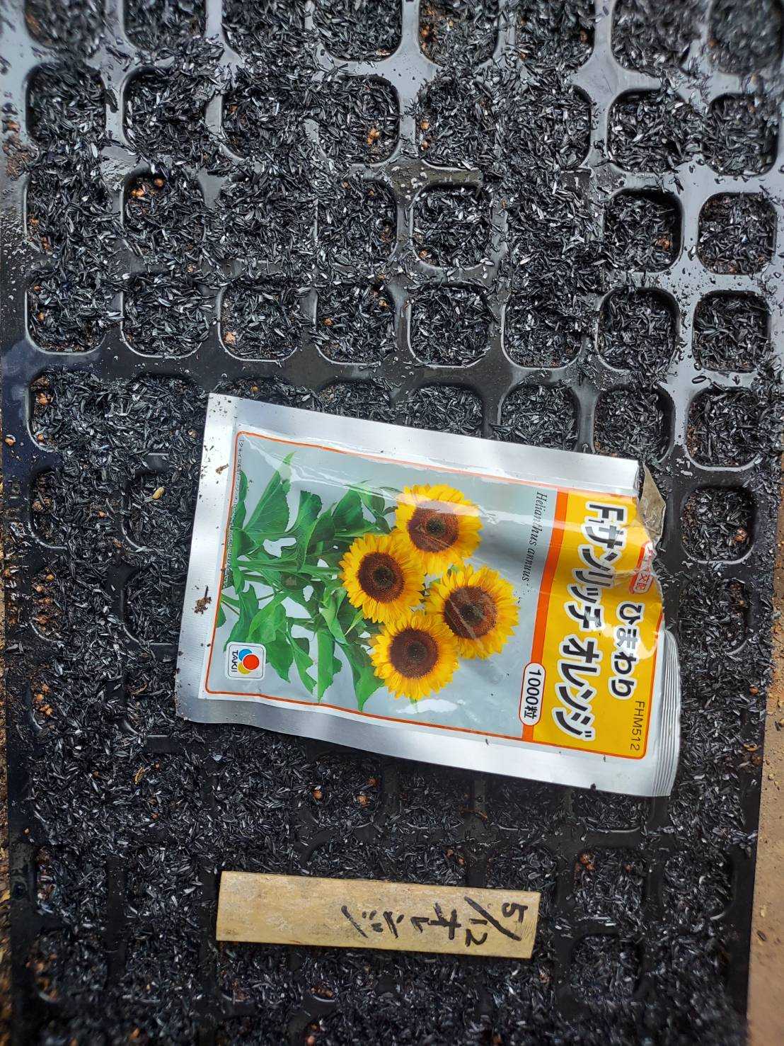 紅貴植える第一畑に100本。200穴のセルトレーに種蒔きするが100本しか芽が出なかった。 4月11日に植えたひまわりの蕾が出来ている。フラワーネットの効果のほどは。幅60に網目は10だ。
