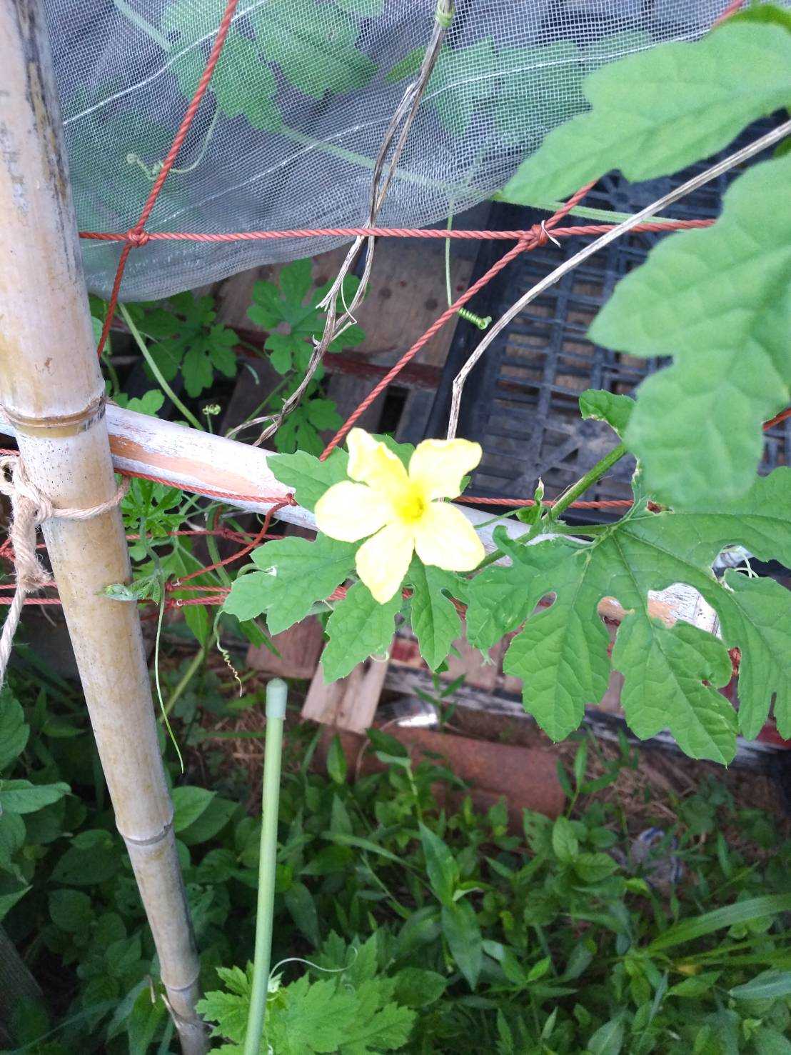 百日草の芽が出てきた。8月6日に植えたダリア咲き混合。撒かぬ種は生えぬ。もうすぐ花が咲くだろう。ゴーヤの花。白ゴーヤがなっている。
