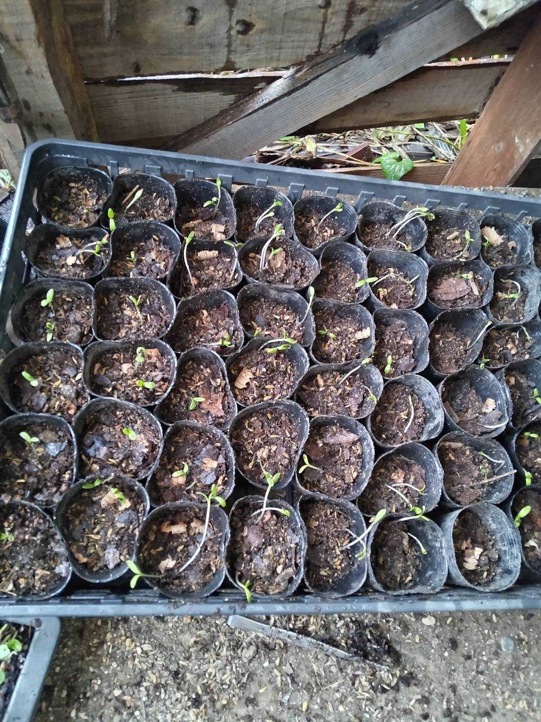 キンセンカをポットへ移す。まだ小さいが根付くかな。今日も雨。雷がなっている。外仕事は出来ないので小屋の軒先で作業をする。育苗箱に筋播きをする。最近セルトレーはほとんど使用しない。