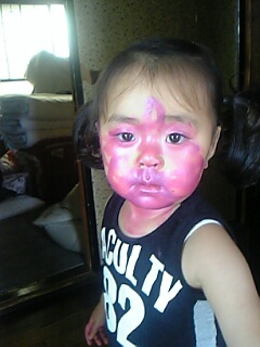 アイリが又やらかしてくれました(ーー;)実家に行った時の事・・うちがヒデを寝かしてた時、アイリはテーブルでお絵かきしてた。珍しくやけに静かだなぁーと思っていた。(いつもはすぐにやめて他の事をするのに)ヒデがやっと寝付いたので、アイリの様子を見ようと思いアイリの所に行ったらびっくり!!(゜o゜)もう腰が抜けるほどびっくり!!なんとうちの母のお気入りの口紅を顔中に縫ってお化けみたいな顔!!あまりにもビックリしすぎて怒る気にもなれずすぐに携帯カメラで撮影!(笑)本人はとても気まずそうな顔(笑) 下まぶたの中も鼻の穴の中も首も口紅がべっとり・・拭き取るのが大変でした・・うちの母が帰ってきて1mmもなくなった口紅を見せたらギャーっ!!どうしたの!?お気入りだったのにぃーっっ又アイリかい!?と。うん・・・これ見て・・ってその写メールを母に見せたら母は暫し唖然としてた・・(^_^;)母も怒る気になれなかったのか笑ってました(^_^;)