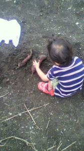 畑に行くと、サツマイモを頂きました。私が野菜の収穫をしていると、なんか静かな次男。何してるの? もらったサツマイモを、埋めています(笑)ちなみに、家から持ってきたミニカーも埋めています。お陰さまで、手も靴も泥だらけ(涙)