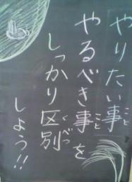今日は、長女の塾の授業参観でした。みんなが一つの校舎に集まり、合同での授業参観です。内容は、パズル。音読。親子で工作。パズルと音読は、時間内で自由に進めるので、教室内は凄い熱気。出来た人から、挙手。ご褒美のシールを貰い、次の課題へ。まるで、戦いのようで、いつもと違う空気に触れ、少しビックリ。 玄関すぐに、このボード。やりたい事しかしない私には、耳が痛いなぁ。 そういや、今日は長男の空手の試合でした。旦那が仕事の為、T家にお世話になる事に。本当、助かりました。ありがとう。そして、長男の結果は一回戦負け。はぁ~、テンション下がります(涙)