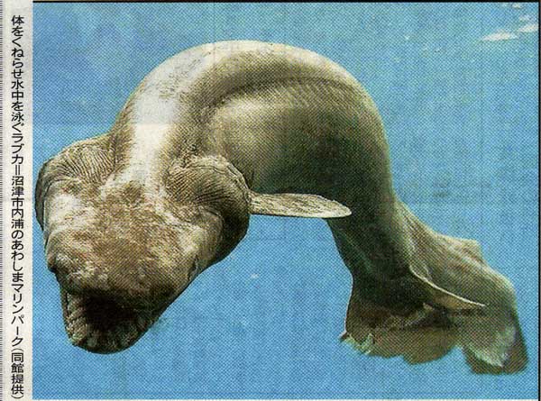 静岡県沼津市の海岸で発見されたラブカである。写真はその時の静岡新聞より勝手に拝借したものです。多分皆さんもTVのニュースで映像をご覧になっていると思います。3億5千万年前のサメの化石に似ているらしい。深海魚と言われているが、古代生物のようである。海にはまだどんな生き物が潜んでいるのか分からない。