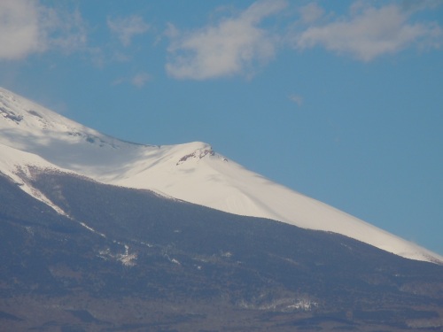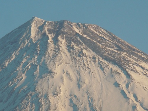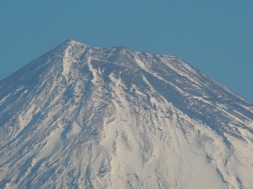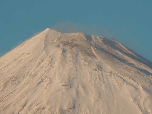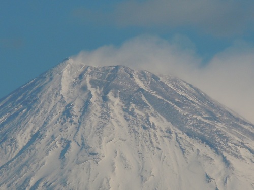 今日の富士山の山頂です。強風のせいで雪がかなり減っているのが分かります。