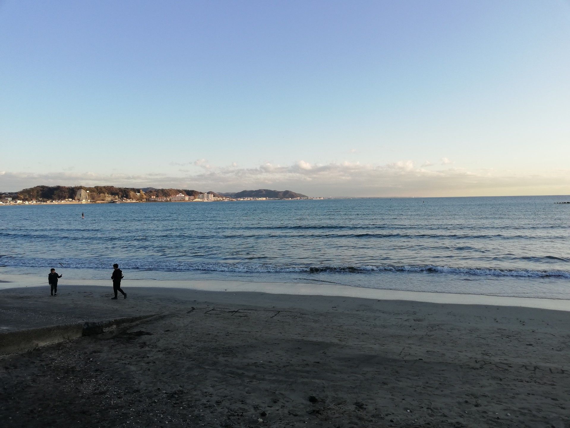さぁ、いよいよ海に向かいましょうか。 お~、やはり湘南の海は素晴らしい。正月だけあって、人もそこそこ居ますね。 ちょっと海に近づいてみますかな。 おお、サーフィンをやっている人も居ますね。波乗りジョニーと言ったところでしょうか(^_^;))) 漁師さんの船もありますね。う~ん、やはり鎌倉は最高だぜ。 浜辺に、大勢の人達が集まってますね。 何かあるんでしょうか? あ、分かりました。ポケモンGO 、あるいはドラクエWALKでメガモンスターが出ているのかな。 まあ、なにはともあれ、楽しい初詣でした。 おしまい・・