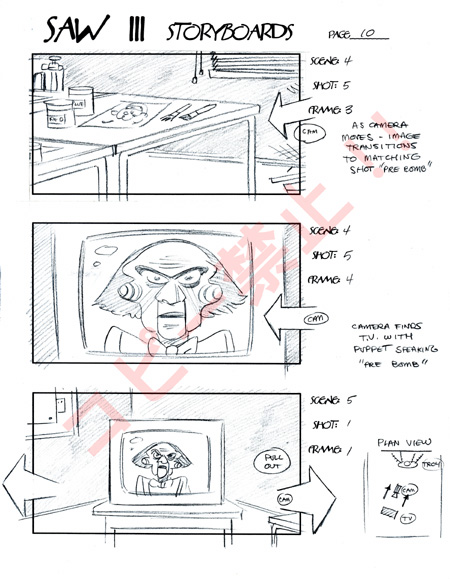 画像は『ソウ3』制作のために描かれたオリジナルストーリーボードです。オリジナルですので手書き。スタッフが使うのはこれをコピーした物です。『ソウ』シリーズ影の主役、ジグソウパペットが描かれている物は数も少なく貴重。この画像では濃淡がわかりにくいと思いますが、鉛筆で丁寧に書かれており所々修正液の跡があります。一番上の絵はフレーム部分で切り抜いて差し替えられているようです。シーン、ショット、フレームナンバー、カメラの位置、動きも書かれています。トロイがチェーンで繋がれているこのシーンのものです。実際の撮影ではアングル、カメラの位置などが変更されていることがわかります。『ソウ』シリーズの制作会社"Twisted Pictures"から入手した物ですが、直接日本へ発送してくれなかったので苦労しました
