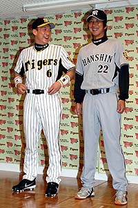 金本(左)はホーム用、藤川はビジター用ユニホーム姿で登場