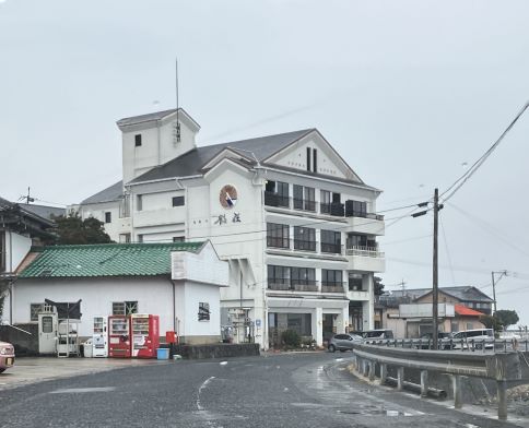 2日目の宿は、佐賀県の竹崎「 たら竹崎温泉 旅館鶴荘 」潮の引いた魚港が見える。生チョコが冷蔵庫に