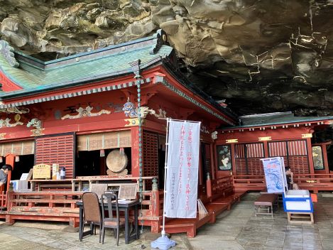 日南市の海岸に面した岩窟の中に建っている「鵜戸神宮」ある事でも有名毎年宮崎でキャンプのカープの選手が来て必勝祈願するんだって。「鵜戸神宮の神様 優勝とは言いませんが、せめて2位にしてもらえませんかね?」これは今年の我ら夫婦の願い。本殿の裏に回ったらこんな感じ。よくこんな所に神社作ったなー。表に戻ってきたら 白い箱を発見。縁日の金魚すくいのようだけど一本釣りみくじ だったー。カツオか海老をこの竿で釣る。カツオ 一本釣り!我が家のオニヤンマの隣「台湾の貸し自転車屋のオバチャンがくれたキーホルダー」の下に吊るしたよ。めっちゃ可愛い。隣の猫も狙っている。