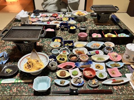 「福島県飯坂温泉 旅館青葉」今回の旅は、旦那がすべての宿を選んだ。みんな同じような宿ばかりだと思ってたけどこの宿の食事は変わっていたよ。小鉢がずらり。部屋食なので、仲居さんがこれを並べる長ーーーーい時間じっと我慢して待ってた。並べるのも大変よね。二人分だし、ご苦労様。綺麗で華やか。でも、素材が被っている物多し。器で胡麻化されている感じもするけど女性には喜ばれそう。お酒は「 会津中将 純米 」私は、生ビール。あんなに小鉢あるのに、何故か?さらに別枠で小鉢有り。これは中鉢で 竹の子の味噌グラタン風。一番美味しかった。お刺身も有り。米沢牛だって。量としてはそんなに多くないので楽しく食べられて良いと思う。でも何を食べたか、竹の子グラタン以外はほとんど記憶が無い。デザートに山形の佐藤錦も食べた。