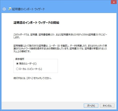 2.再インストールを想定しエクスポート可能とする場合はチェックをはずす、あとはデフォルト。取得用パスワードは管理者は銀行から送られてきたもの、一般ユーザーは管理者に発行してもらったものを入力。