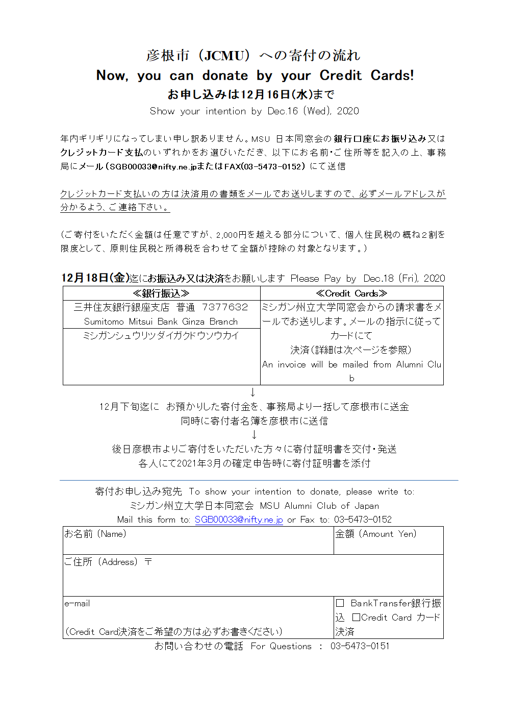 JCMUを支援するための彦根市への寄付をお願いいたしますDonation to Hikone City to support activities of JCMU 本年もJCMUを支援するための彦根市への「ふるさと納税」に、皆様のご協力をお願いします。2014年から開始致しました、JCMU の活動支援に限定した「彦根市へのふるさと納税」は今年で7回目となり、昨年は皆様のご理解の賜物で160万円もの寄付をすることができましたが、本年はコロナウィルスの関係で、JCMUの活動そのものがストップしていて、財政的にも非常に厳しい状態にあります。このような中、MSU日本同窓会の皆様のご厚意による寄付は、今まで以上に重要な意味を持っています。 MSU 日本同窓会は、継続してこのJCMUの施設を応援する彦根市への寄付を募集させていただきます。毎回申しあげますが、寄付金に対するお礼があるふるさと納税とは違い、見返りを求めない形の寄付ですので、皆様のご理解ご協力のもとに今後も継続していきたいと思っています。なお、寄付額から2,000 円を差し引いた部分については、確定申告時に所得税や住民税の控除の対象となります。本年も同封の用紙にご記入をいただき、12月18日(金)までにお振り込み下さい。寄付金は一括して会としてとりまとめ、控除証明書を彦根市から直接皆様のお手元にお送りさせていただきます。年内ギリギリになってしまい申し訳ありませんが宜しくお願いします。振り込みのご連絡を事務局にいただくのは締め切り日を12月16日(水)までとさせていただきますので、慌ただしい中、ご協力をお願いします。 MSU Alumni Club of Japan has been helping JCMU (The Japan Center for Michigan Universities) since 2014 through the donation to Hikone City where JCMU locates. We could donate JPY 1,600,000 last year.Due to the Covid-19, JCMU cannot operate its educational functions by utilizing their facility, thus your financial support is seriously needed.We call for 2020 donations so that please fill and return the enclosed form to declare your intention to donate by Dec. 16 (Wed) and send money to our bank account by Dec.18 (Fri) 用紙↓をダウンロードしてお使いください。