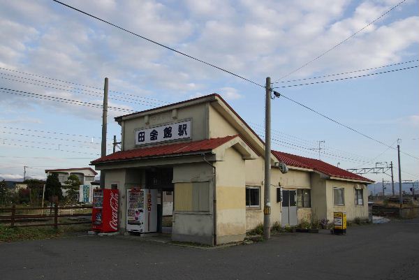 駅名に魅かれて、国道から街中の駅をめざしていくと、こんな映画の書割のような駅舎がポツンと建っていました。名前のとおりの、田舎の館。無人駅の一部は喫茶店になっていて、切符売り場の窓口でスナックやお菓子を売っているとか。もう、楽しすぎます。