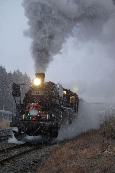 雪の走行写真を撮ること自体が久しぶりで、空シャッターを切ってモニターで確認し、慎重にシャッタースピードを選びました。スノープロウにまとわりつき始めた雪と、クリスマスのイルミネーション。確かな手応えをかじかんだ指に感じたとき、何だ、11号機は播但線でスノープロウ付けてたじゃないか、と50男に始まった記憶のバラつきに、しばし悄然としました。