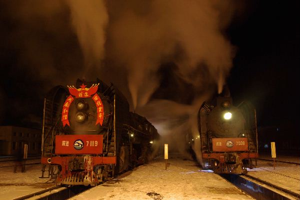 12月28日午前4時。出区する2輌の前進が、DLの屯する机務段構内のはずれに並び、中国特有のイエローの優しい色合いで、スポットライトが当たりました。あの頃のカメラはすぐ凍って、シャッター音が弱くなったよなあ、などと思いながら、あたり前のように作動するデジタル一眼で、あの頃と同じように身も心も震えながら、バルブのシャッターを押し続けました。