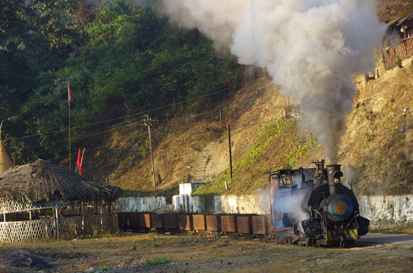 今朝、インドから帰ってきました。心配した飯の辛さもそれほどではなく、お腹をこわすこともなく、アッサム州の辺境の炭鉱に息づく現役の蒸気機関車を、2日と少しの短い間でしたが、堪能してきました。今回の写真は、2012年初の朝の光を浴びる、というのは嘘で(笑)大晦日の撮影ですが、朝日が山の間から差し始めた午前6時過ぎ、短いトロッコ編成を牽いて発車するダージリン型の蒸機です。