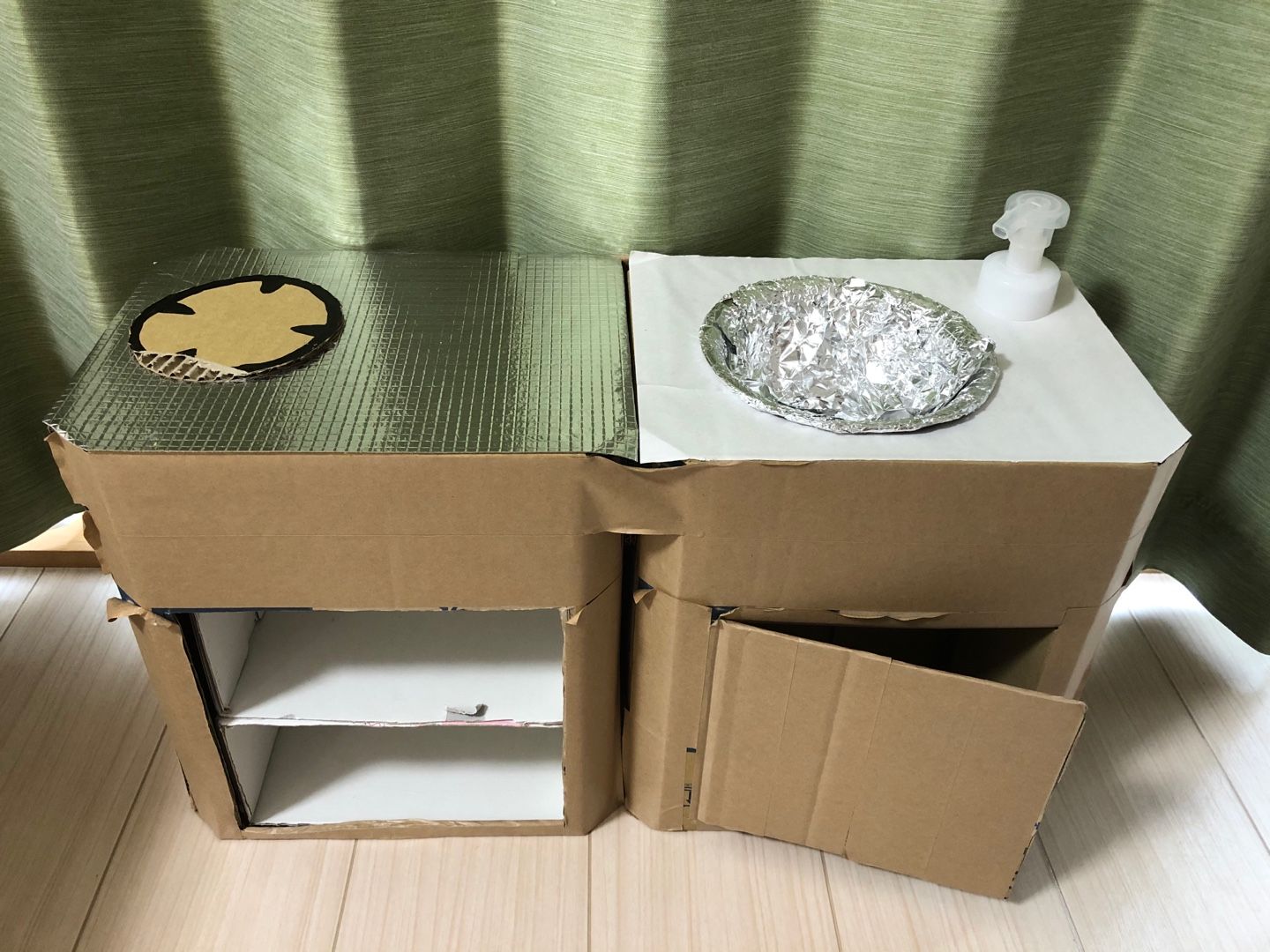 子どもが、ままごとに ハマっていたので、ステキ主婦の 皆さんの見よう見まねで、 ままごとキッチンを手作りしてみました。 ガムテープむきだしな、雑なヤツです。 (コンロの部分、犬にかじられたし) すると、どうでしょう! 一回も遊んでくれないーーー涙 完成した日から、ピタリと ままごとで遊ばなくなったーー 雑なキッチンが、やる気を削いだ のかしら。。。 1ヶ月ほど置いておきましたが、 ただただ邪魔なので、 ついに解体しました。。。 手作りのいいところは、 迷いなく捨てられるところ! あまりにもかわいそうなので、 記念撮影…。 やっぱり子どもは騙せないか。 クオリティーって大事! と悟ったのでした。チャンちゃん!