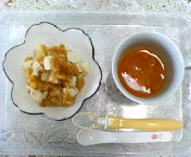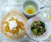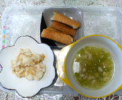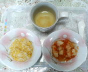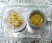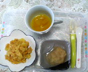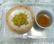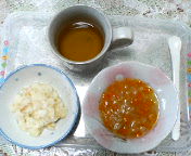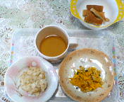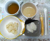 (午前8時40分~)・豆腐と根菜のカボチャスープ煮(約55g)・パンのりんごミルク煮(1/2枚)今朝もフルコース遊び(スプーン2本にお皿で食べ真似)に余念がない(^-^)まぁ遊びながらも食べてくれたのでホッとする。カボチャスープ煮は完食!りんごミルク煮は1/3程食べた。(午前11時半~)朝寝15分で起きた。早っ!起きた後、小腹が空いたのかマンマコール・小魚せんべい1/2枚るーたんは遊びながらも煎餅をしっかり手に握っていてしばらくしてアム!(^-^)(午後13時45分~)昼前に歯医者に出かけていて13時に帰宅。なので、るーたん空腹でワンワン大泣き。。泣き止まないので、仕方なく抱っこしながら離乳食作り(+。+)腕がダレて しんどかった。。☆栗かゆ(約40g)・キャベツ&鶏胸ひき肉のスープ(約80g)・人参ホットケーキ(1/2枚)栗は初の食材。空腹だっただけに、栗かゆ完食!久しぶりに お粥をたくさん食べてくれたので嬉しかった♪スープも挽肉を少量残しただけで、あとはゴクゴク一気飲みで飲み干した!大泣きしていたので喉が渇いていたんだねー(^0^)ホットケーキは手に持ったものの遊び物にされて終了ー。☆☆☆☆☆☆☆☆☆☆☆☆☆☆☆☆☆☆☆☆☆☆☆☆☆☆☆☆17時過ぎに外出。母と祖母のお見舞いに出かけた。お見舞いが長くなって帰り始めるのが18時半を回っていた。そのため帰宅途中の車内で るーたんは空腹になり、マンマコールをしながら ぐぜり始めたなので・・・(午後18時半~)・マンナ ビスケット2枚・麦茶帰宅後に離乳食を作るつもりでいたが、オッパイを欲しがっていたので授乳。授乳後にグッスリ眠ってしまったので今夜は離乳食なし。。るーたん ごめんよー(・+・|今夜は辛抱しておくれ。。