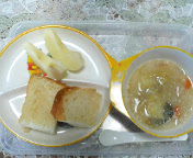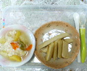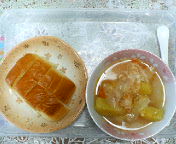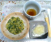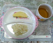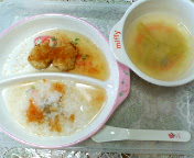 (午前中)・ミルクパン粥(約40g)☆調理用に初!牛乳使用!・根菜煮込み(人参、玉葱、じゃが芋)(野菜スープ含んで約50g)・パンのみみ・・・食べ遊び用に準備根菜煮込みは食べ遊びをしながらも、ほぼ完食♪ミルクパン粥は食べ遊びの標的になりぐちゃぐちゃにされて終了・・・。逆に食べ遊び用に用意していたパンのみみを手で持って口へ運びアムアム!やっぱり自分で持って好きなように食べたいみたいだ(午後) ・根菜粥 とろけるチーズ入り(約50g)今日は午後からエアロビクスの仕事がありバタバタ帰宅したため、ついつい手抜きの離乳食になってしまった(^-^;根菜煮だと主食と野菜類だけになってしまうのでたんぱく質を摂取させるためにチーズを入れたおほほ。