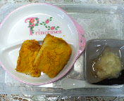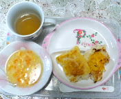 6日の朝。私は、体調不良の中、るーたんはゴキゲンだった。昨夜は久しぶりに23時就寝後に朝までノンストップで7時まで眠ってくれた☆ただ、寝起きからシャックリ。すぐに布オムツを替えてあげた。いつもならば、私が就寝する時に眠っている るーたんの布オムツをそっと交換してあげているのだ。たいていは眠っているままオムツ替えに成功する。たまにオムツ交換時に失敗してるーたんが目覚めてしまったらしっかり目覚める前に急いで授乳して再度寝付かせているのだ。だけど昨夜は身体がだるくて悪寒がして、就寝時に るーたんの布オムツを交換するのを忘れていた。。だからオシッコでオムツがビッショリ濡れてオムツが重かった。。さぞ冷たかったろう。。悪かったなぁ(+-+)============================さて、6日の離乳食。。まさにタイトル名通りに義務感だけで必死に作った。(午前8時45分~)・コーンフレーク(約30g)・バナナのきな粉ミルク煮(約50g)コーンフレークは食べ始めはスプーンで食べ真似をしてグチャグチャに遊んでいたが半分は食べた。自分でも つかみ食べしてアムアム。バナナのきな粉ミルク煮はパクパク食べてスープまで飲み干して完食!るーたんは初期の頃にバナナを食べ過ぎて最近飽き気味で食べなくなっていたが久しぶりに好調に食べてくれた♪(午後13時25分~)・人参&カボチャのホットケーキ 各2枚・パンプキンスープ(約100cc)ホットケーキは以前、ユキちゃんママ宅でご馳走になった人参&ホウレン草のホットケーキを参考に作った。今日なぜホットケーキにしたか?というと熱で身体がだるくて なるべく立ち仕事を省きたかったから、座ってでも作れるものを選んだのだ。小さく1口サイズにちぎって皿を置いていたら遊び食べしながらも時々口へ運んでアム!人参・カボチャの各1枚ずつを食べたので十分だろう。カボチャスープは半分(50cc)くらい飲んだ。(14時35分~)一人遊びに没頭して小腹が空いたのか?るーたん『マンマンマンマ・・・』とマンマコール!なので・・・・小魚せんべい 1枚(午後18時40分~)パパから るーたんをお守りしてもらっている間に私は乳腺科のある内科へ診察に出かけていた。・・なので帰宅が遅くなったため、るーたん空腹で不機嫌。。まだ離乳食は今から作らないといけないのでとりあえず・・・・人参&カボチャのホットケーキ 各1枚各々半分ずつくらい食べたが昼にもあげていたので物足りなさそうに再度マンマコールをする。。ごめんねー!今から作りますからに 少々お待ちを。。(午後19時10分~)・ワカメ玉子おじや(約70g)・カボチャスープ(約30cc)・人参&りんごゼリー(約30g)「カボチャスープは昼にも出したけど今日は勘弁してもらおう。」・・・とるーたんに飲ませたが10cc程しか飲まなかった。。やっぱりダメだったかしら?おじやも半分くらい食べて口を開けなくなった。でもゼリーは完食!まぁこんなものかな。食前にホットケーキも食べていたしね。