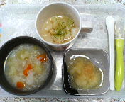 +++++++++++++++++++++++++++++昨日はバテ気味で一日遅れの離乳食日記になりました~(^0^;エヘヘ。でも最近、私のブログへ訪問してきてくれて読んでいって頂ける方が増えてきているのですごーーーーーーーーくありがたく嬉しく思っています(^0^)♪どうもありがとうございます!!だから俄然やる気モードであります(^-^)!ただ、育児、仕事の合間に書き込みしているのでまだまだ充実しておりませんが、少しずつ作り上げて行こうと思っています。今度もどうぞよろしくお願いしまーす♪またご意見、ご感想(コメント)を何なりと書き込み頂ければ嬉しく思ってます。お願いします(・0・)+++++++++++++++++++++++++++++さてさて、では離乳食日記ー!(午前)・バナナミルクパン粥(約30g)・すりリンゴ(約15g)バナナが最近飽きてきていたので食べてくれるか微妙だったが、パン粥は出だし好調にモグモグ食べ始めてくれた。なので、最初の2~3さじだけスプーンであげてその後はプレートをテーブルに置き、わざと知らん振り・・・。私は るーたんを気にしていないフリを続け、自分のパンを手でちぎって『あーおいしいなぁ♪』と言いながら大げさにアムアムのデモストレーションをした(^-^)そうしたら・・・じーーっと私の様子を見てラックのテーブルにあるパン粥を手で握って口へ!パクッ!と食べてアムアム食べ始めてくれた♪そして完食~!イエーイ(^0^)☆私の”自分でアムアム作戦”大成功~!いいぞいいぞー!るーたん!その調子だ。すりリンゴも完食!今までリンゴのみじん切りはあまり好んで食べてくれなかったので、今回わざとリンゴをすってあたえた。よしよし!(午後14時半~)・根菜煮(豚汁風味)(約50g)これは昨夜の根菜煮にカボチャスープをたして煮込んだ物をあげた。ちょっと与えるつもりだったのに、スープまで飲み干して完食ー!スゴーイ!本来この時間帯には”ビスケット”を1枚あげていた。しかし先週土曜(3日)から、この時間帯にスープ系をあたえていたら、かなり食べっぷりがいいのでプチ3回食のようにしてあげていた。いつの間にか与え始めて5日経っている!これはもう自然と3回食で根付いてきているみたいだ☆何か嬉しい!今までは離乳食本で少し神経質に進んでいたが、先月8ヶ月目(モグモグ期後半)からは大雑把になってきて(^-^; 本を読むことさえしなくなっていただけに、「カミカミ期(9ヶ月~)から3回食にするべきか?どうしようか?」と最近考えていた最中だった。なので、自然に3回食に移行してきたことが本当に嬉しい(^-^)♪(午後18時53分~)・根菜と変わりつみれのチキンスープ仕立て(約70g)☆変わりつみれ:鶏ひき肉&豆腐・7倍粥(約20g)お昼にたくさん食べていたので夕食はあまり食べないだろう・・・と思っていたが全て完食ー!ホェー(*0*)るーたんは自分で食べたがって、食事の途中に私の顔色を窺いながらスープ皿の中に手を突っ込む。私が『うん!いいよ!アムアムして』と言ったら、じゃが芋やつみれを手に取って自分の口へ運びパクッ!じゃが芋やつみれを細かく潰していないのにモグモグ上手に食べた!「ヘェ~!こんなに大きな固まりも、もう噛み砕けるくらいになったんだー♪」と嬉しく思った。それで汁も残らず完食ー!いや~昼、夜と続けてよく食べてくれたなぁと感心した。