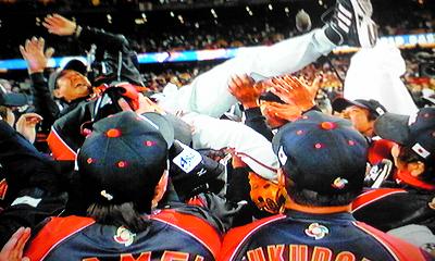 WBC優勝おめでとうございます!! やった~!! \(≧∀≦)/ 侍ジャパン 優勝胴上げ 2009年3月24日(日本時間)、ロサンゼルス、ドジャースタジアムでの決勝戦で、日本が10回、5-3で北京五輪金メダルの韓国を破り、2006年大会に続く2連覇を果たしました! ♪祝v(^O^)v祝♪ 10回2死2、3塁、イチローが勝ち越し2点打を放つ