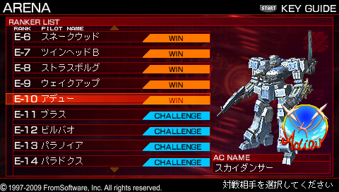 これでほとんど情報規制は無くなったかな今回紹介するのは普通に予想できていたことw画像が多いので3回に分かれると思われでは------------------------------------------------------------タイトル : ARMORED CORE 3 Portable(アーマード・コアスリーポータブル)機種 : プレイステーション・ポータブルジャンル : 戦闘メカアクションプレイヤー人数 : 1人(通信時1~4 人)発売日 : 2009 年7 月30 日発売予定価格 : 標準価格3,800 円(税込3,990 円)©表記 : ©1997-2009 FromSoftware, Inc. All rights reserved.その他 : 開発状況 100%CERO 審査 : A 全年齢対象公式サイト : http://www.armoredcore.net/クリア後にも新たな戦いが!!熾烈な2vs2バトル“エクストラアリーナ”!!ミッションクリア後に新たに登場する“エクストラアリーナ”。通常のアリーナとは違い、2vs2でのチーム戦となります。プレイヤーは味方となる僚機を選び、24 ものランカーACチームと戦い抜きます。-------------------------------------------1日画像10枚までとかひどすぎるwこれは日付が変わるのか24時間経つのかどっちだ・・・明日は祭りだ~!でも午前中部活が・・・