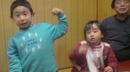 みなさん!おつかれさまです!昨日は成人の日でしたね♪日曜日の夜に・・田舎に帰って来た姉夫婦たちとみんなで仕事終了後に焼肉に行きました♪姉の息子と兄の娘です♪(6歳と3歳)どうやら・・めいっ子はおいっ子が大好きなようです♪(なんどもキスを迫ってました!)そして・・焼肉をゴチソウになった後は・・カラオケボックスへ!(カラオケボックスは室戸で一軒だけ)しかし・・成人式前夜の影響で・・満室でした・・(涙)子供がいるので・・スナック(飲み屋)で歌うわけにはいかず・・カラオケは断念・・。おいっ子は歌いたくて・・しょうがなかったのでしょう。帰る車で何度も「カラオケ歌いたい!」と連呼してました・・。(字(歌詞)が読めないのにカラオケ歌えるかは疑問ですが・・) 「おいっ子よ・・大人はガマンするコトも必要じゃ・・。」by若だんな