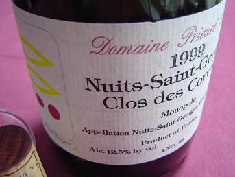 ニュイサンジョルジュを表現するのによく使われている「カシス」ですが、NSG愛好家?としてたくさん飲んだ中で、今まであまりその風香を感じたことはなく(ただ考えて飲まなかっただけかも)本日も普通に一口やっているとリキュールのような少しフローラルな並外れた濃い「カシス」の芳香に驚いてしまった。昨年飲んだここの"1erCru"でも感じたが、NSGらしからぬジャミーな造りとあいまってこのワインにもNSG的に違和感に驚いたと言うべきか。いずれにしろ私的にお恥ずかしながら初めての感覚であった・・。ニュイ・サン・ジョルジュ1erCru クロ・デ・コルヴェ’99 ドメーヌ・プリューレ・ロック大昔初めて日本でリリースされたころに水平でクロドベーズやらクロヴジョやらNSGやら飲んだ時は全くこのロックについてはまともな印象はもっていなかったが、その時とは違い、ここ数年完成度の高いワインに仕上がっているとも言えましょう。あえてナチュラルワインとしてこのレベルでいて、後に熟成感が楽しめるとしたら最高だろう。このワインの印象から言うと若干酸が弱めなものの膨大なタンニンと分厚い果実味からして10年後(もちこたえるなら)はかなり面白いものとなると思う。樹齢60年を超える古木と畑は最高であり、若いドメーヌの考えに少しわたくしめの固い頭も順応してみるといいだけのことか・・。そろそろNSG考もリセットしなきゃ。少し還元香の後に、カシス、甘いシトラス系フローラル、黒系果実のコンフィ、ザクロ、ミント、ミネラル、雰囲気のあるNSGテロワールも感じます。(ただこのフローラルの香りはやっぱりとってつけたような感があって少し馴染めないなぁ)
