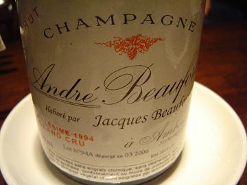 あいにくの天気にめげることなく無事開催の運びとなりましたいつもの会ですが、面白い内容で楽しい一夜を過ごしました。テーブルの上のワインの佇まいもなぜか春を感じさせるようでとても華やかな感じです。またまたお集まりいただいたメンバーに感謝感謝。ブリュット・アンボネイGC’94 アンドレ・ボーフォールまずはシャンパンから。私的に2度目ですが、ここのエチケットはいつ見ても格好いい。美味しそうな感じがにじみ出ています。少しナッティな印象から始まり上質な葡萄の風味がきれのいい酸とあいまってため息が出ます。なんともきめの細かい泡でとてもやさしいソフトな舌触りです。かなりストラクチャーもしっかりしていてワンランク上のプレステージシャンパーニュのような品格を感じます。コルトン・シャルルマーニュ’86 ルイ・ジャド最初はブラインドで出してみました。あまりにも状態が良すぎてVTを15年ぐらい間違えてしまうのも無理もありません。かなり固い印象から徐々に正体を現してきました。とにかくミネラリーで、香りのニュアンスがきっちり順番にでてくる正統派シャルドネの真骨頂です。焦がし砂糖が出てくる頃も酸のへたりもなく紅茶や干し柿の愛らしいでしゃばらない芳香もとにかく素晴らしい。シャンベルタン’00 ドメーヌ・ポンソ えぬう氏持参存在は知っていたものの、今回見るのも初めてでした。やっぱり年産1樽程度なのでしょうか。世によくいるポンソ鬼門派(私?笑)もぶっ飛ぶびっくりの逸品です。ロゼと見紛うような鮮やかなキャンディーカラー。赤系果実の愛らしいピュアなピノの香りと葡萄エキスの旨みダシが効いています。昔の木造校舎の教室やコンクリ地下室の懐かしい香りもします。(スーボワでしょうか?)いやはやなんともいいですねぇ。えぬう氏、えいち氏も大絶賛です。ジュリエナ’88 ジャック・シャルレこれはえぬう氏がブラインドで出したもの。私はなんとVRのボーモンあたりか、Cミュジニーなんてとりとめもないことを言っちゃいました・・・酔っているということで許して(笑)。いやな予感はしましたが、「ジュリエナ」とは・・ガメ・・ですか。ブログでもたまにお見かけしますがここでも古いガメの登場です。いや~参った。あとは言葉になりません。悔しさ半分ピノと変わらぬおいしさに、造り手がすごいんですよ!ということで〆ておきます(笑)。今回は本数は少ないけどとっても充実していました。しかしみんな飲むペースが早いなぁ。1次会も終わり、2軒目はワインバーにて飲み比べセットで品種あてをしながら日本のハッピーワイン”SOLARIS”信州シャルドネ・マセラシオン・リミテ’01マンズワインをいただいた。ピーチの香りのあるシャルドネ。これでもう少し余韻があればいいのになぁ。品種あてはカベルネをメルローと間違え、自信のあるパスグラも見抜けなかった。いや~これはダメダメ修行やり直しです。