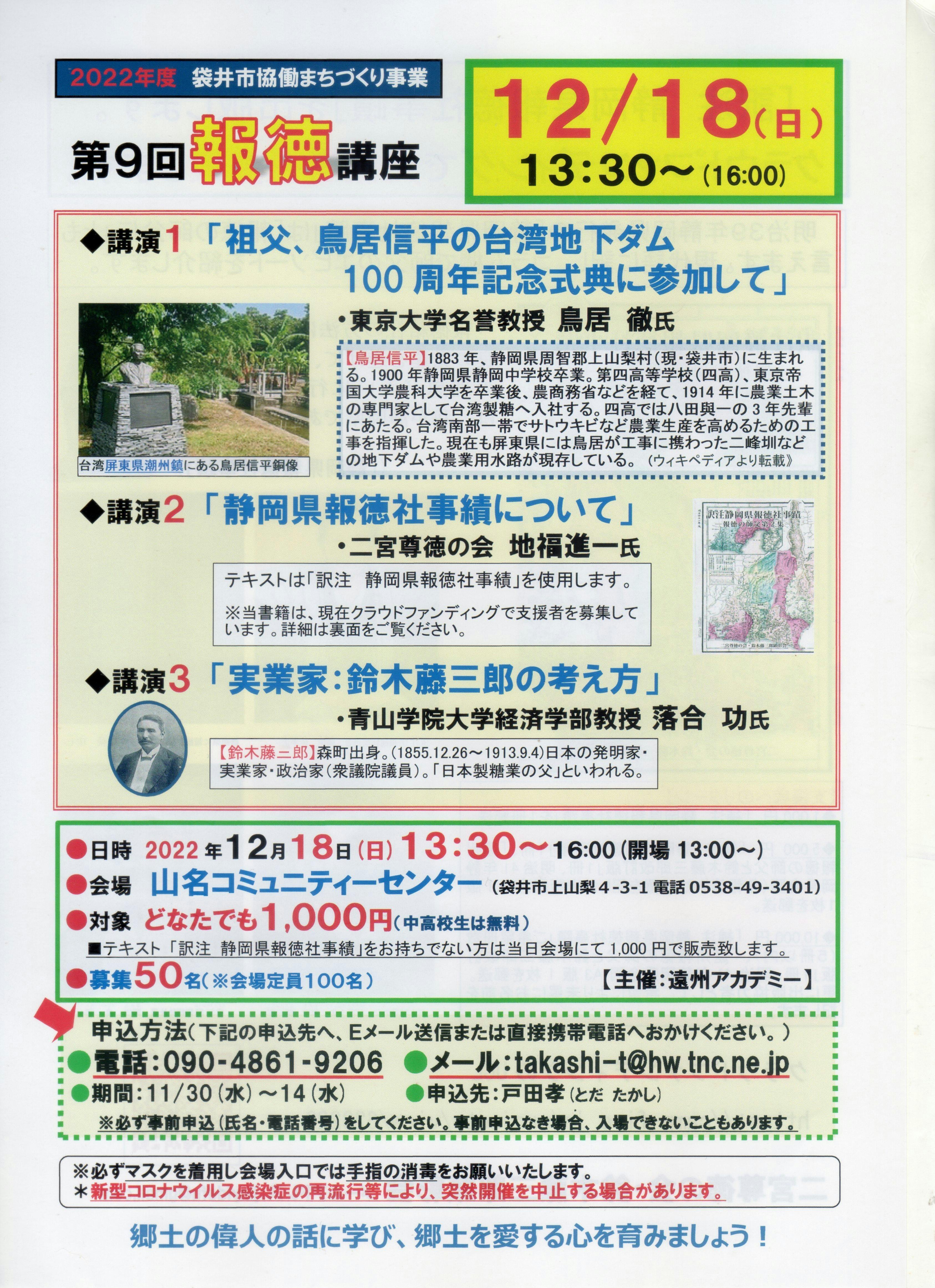 遠州アカデミーのTさんから、12月18日の第9回報徳講座の案内が届いた。裏面には「訳注 静岡県報徳社事蹟ー報徳の師父第2集-」のクラウドファンディングのお知らせも載せていただいている。Tさん、ありがとうございます。さっそく20か所ばかりに郵送した。前回、東京からわざわざ新幹線に乗って、しかも袋井から片道1時間ほどを往復して出席されたMさんにも敬意を表してお送りする。「Mさま いつもお世話になります。 遠州アカデミーのTさんから「第9回報徳講座」のチラシが届きましたのでお送りします。 報徳講座も今年で9回目です。年に一度こうして袋井の地で懐かしい面々と一緒に「一座建立(いちざこんりゅう)」できる楽しいひと時を持てることを幸せに思います。一緒に同じ方向を見て前進できる仲間を持てる、限るある人生にとってこんな幸せなことはありません。台湾で本年鳥居信平氏が築造した地下ダムの100周年記念事業があり、鳥居先生が御子孫として招待されました。鳥居先生はその模様をお話くださいます。また青山学院大学の落合先生が「実業家・鈴木藤三郎の考え方」として、藤三郎の思想の意義を学術的にお話くださいます。本来、報徳の師父シリーズは、鈴木藤三郎顕彰第2集に位置付けて構想したものです。遠州報徳の土壌からいかにして鈴木藤三郎という偉大な実業家が出現したのかを解明するものです。それはおのずから、遠州報徳のリーダーたちの伝記でもあります。それは今でも多くの意義をくみ取ることができ、本は公共図書館。大学図書館に寄贈し、未来の世代への私たちからのギフトとします。報徳とは先人に感謝し、私たちもまた次世代のものたちへ何か良いものを遺そうという営み(推譲)でもあります。ご都合がつくようでしたら、また講演会へお越しください。