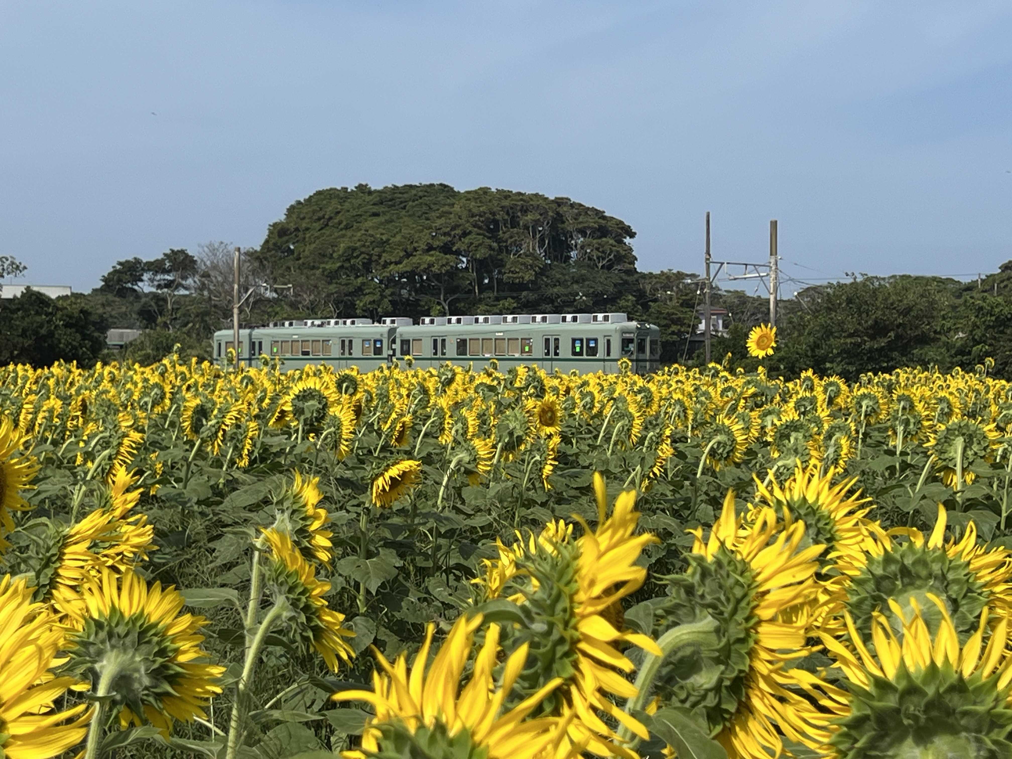その通称 「シニアモーターカー」 が、犬吠駅付近のひまわり畑の脇を走っています。満開のひまわりの黄色と、緑の電車がいいコラボですね!